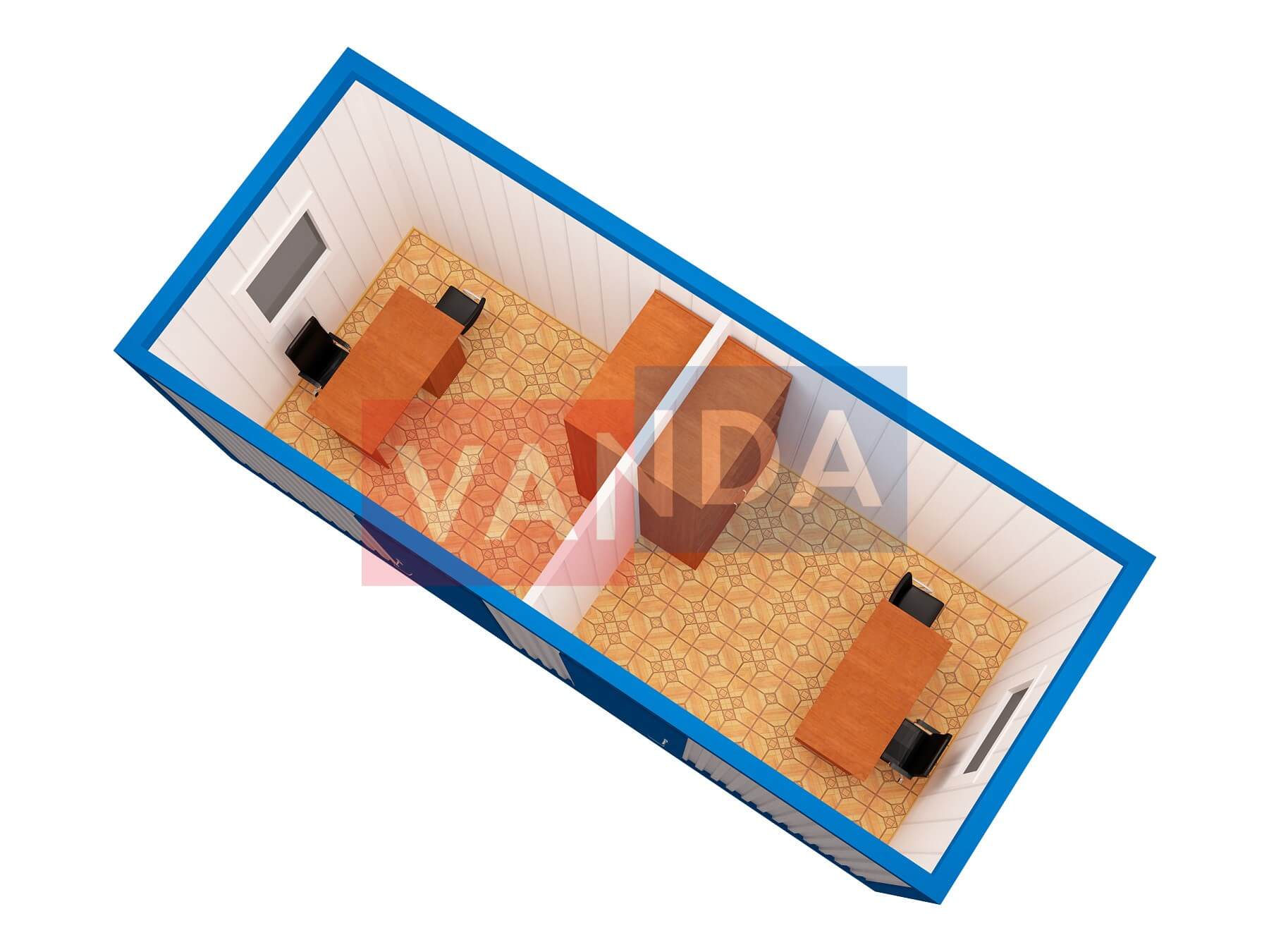 Блок-контейнер под офис №2 (вариант 1) изготавливается из несущего каркаса (верхняя и нижняя обвязка): швеллер 120х50х3 мм., угловые стойки: сложно - гнутый угол 90х90х3 мм., крыша блок-контейнера: металл сварной 0,9-1 мм., качественная наружная отделка: оцинкованный профлист, внутренняя отделка стен: Панели ПВХ, внутренняя отделка потолка: Панели ПВХ, вспомогательный деревянный каркас (стены): брусок 40х75 мм., лаги пола: обрезная доска 40х100 мм., лаги потолка: обрезная доска 40х100 мм., выполнено утепление: Минеральная вата «ISOVER» – 100 мм. и пароизоляция: плёнка техническая, черновой пол состоит из: обрезная доска 20 мм. (2 сорт), чистовой пол покрыт: ДСП строительное 16 мм., отделка пола: линолеум полукоммерческий. Контейнер комплектуется окнами: ПВХ однокамерное, одностворчатое, п/о 900х1100, входной дверью: металлическая, утеплённая (Россия) и внутренними дверями: МДФ (при наличии перегородки). Если в БК присутствуют перегородки, то для них используется: брусок 40х50 мм.