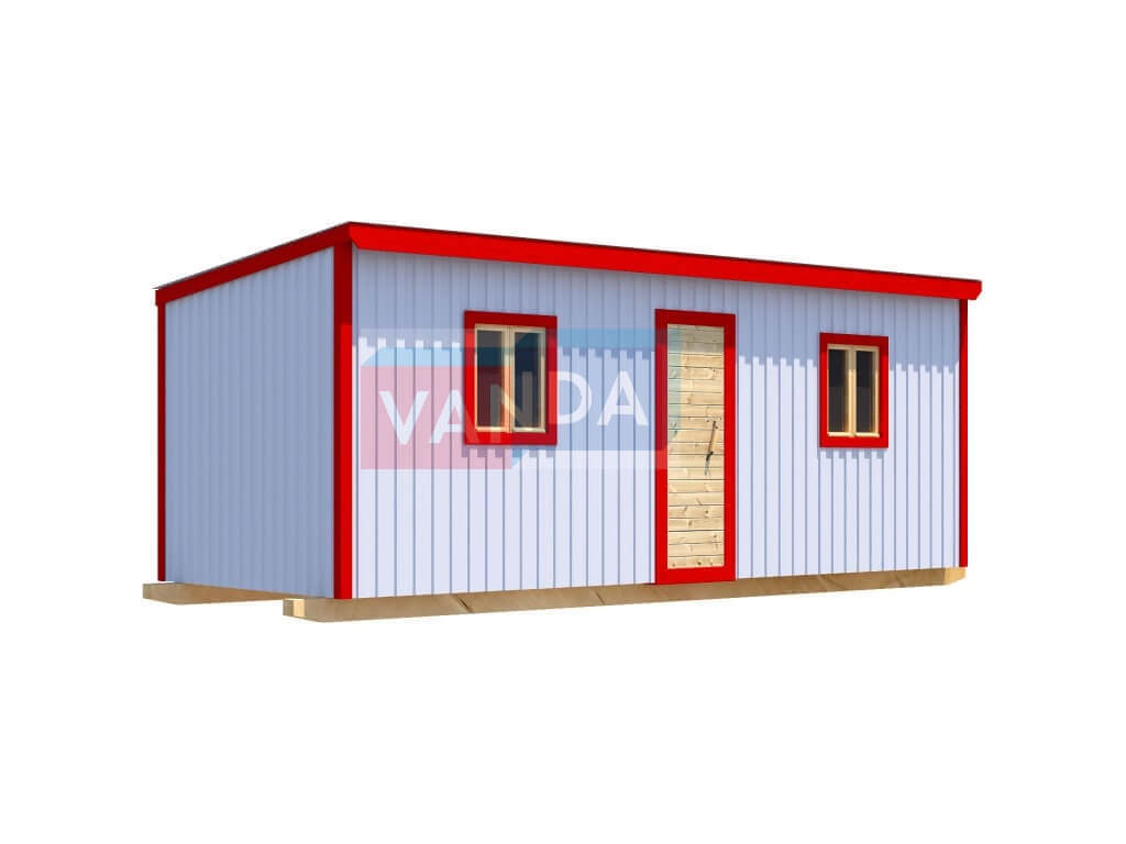 Строительная бытовка со сборкой на месте №8 (вариант 2) изготавливается из качественных материалов: обвязочный венец (сани): брус 100х150 мм., половые лаги: обрезная доска 40х150 мм., через 80 см. (плашмя), черновые полы: обрезная доска 20 мм. (2 сорт), (не сплошной настил, через 10 - 15 см.), чистовой пол покрыт: ДСП строительное 16 мм.. Для изготовления каркаса и перегородок используется: брусок 40х50 мм.. Для стропил используется: обрезная доска 40х150 мм., на кровлю ложится: оцинкованный профлист. Качественная наружная отделка: Профлист, внутренняя отделка стен: Оргалит-ДВП, внутренняя отделка потолка: Оргалит-ДВП. Выполнено утепление: Минеральная вата «ISOVER» – 50 мм. и пароизоляция: плёнка техническая. Бытовка комплектуется окнами: деревянное, двустворчатое, одинарное остекление 800х800 мм., входной дверью: деревянная, наборная и внутренними дверями: деревянная, наборная (при наличии перегородки).