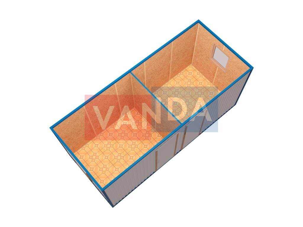 Бытовка металлическая двухкомнатная 6х2,45 изготавливается из несущего каркаса (верхняя и нижняя обвязка): швеллер 60х40х3 мм., угловые стойки: сложно - гнутый угол 63х63х5 мм., крыша блок-контейнера: металл сварной 0,9-1 мм., качественная наружная отделка: оцинкованный профлист, вспомогательный деревянный каркас (стены) выполнен из брусок 40х75 мм., лаги пола: брусок 40х75 мм., лаги потолка: брусок 40х75 мм., выполнено утепление: Минеральная вата «ISOVER» – 50 мм. и пароизоляция: плёнка техническая, черновой пол состоит из: обрезная доска 20 мм. (2 сорт), чистовой пол покрыт: ДСП строительное 16 мм., отделка пола выполнена из качественных материалов. Контейнер комплектуется окнами: деревянное, двойное остекление 800х1000, входной дверью: ДГ 21-8 обшита снаружи оцинкованным листом, врезной замок и внутренними дверями. Если в БК присутствуют перегородки, то для них используется: брусок 40х50 мм.