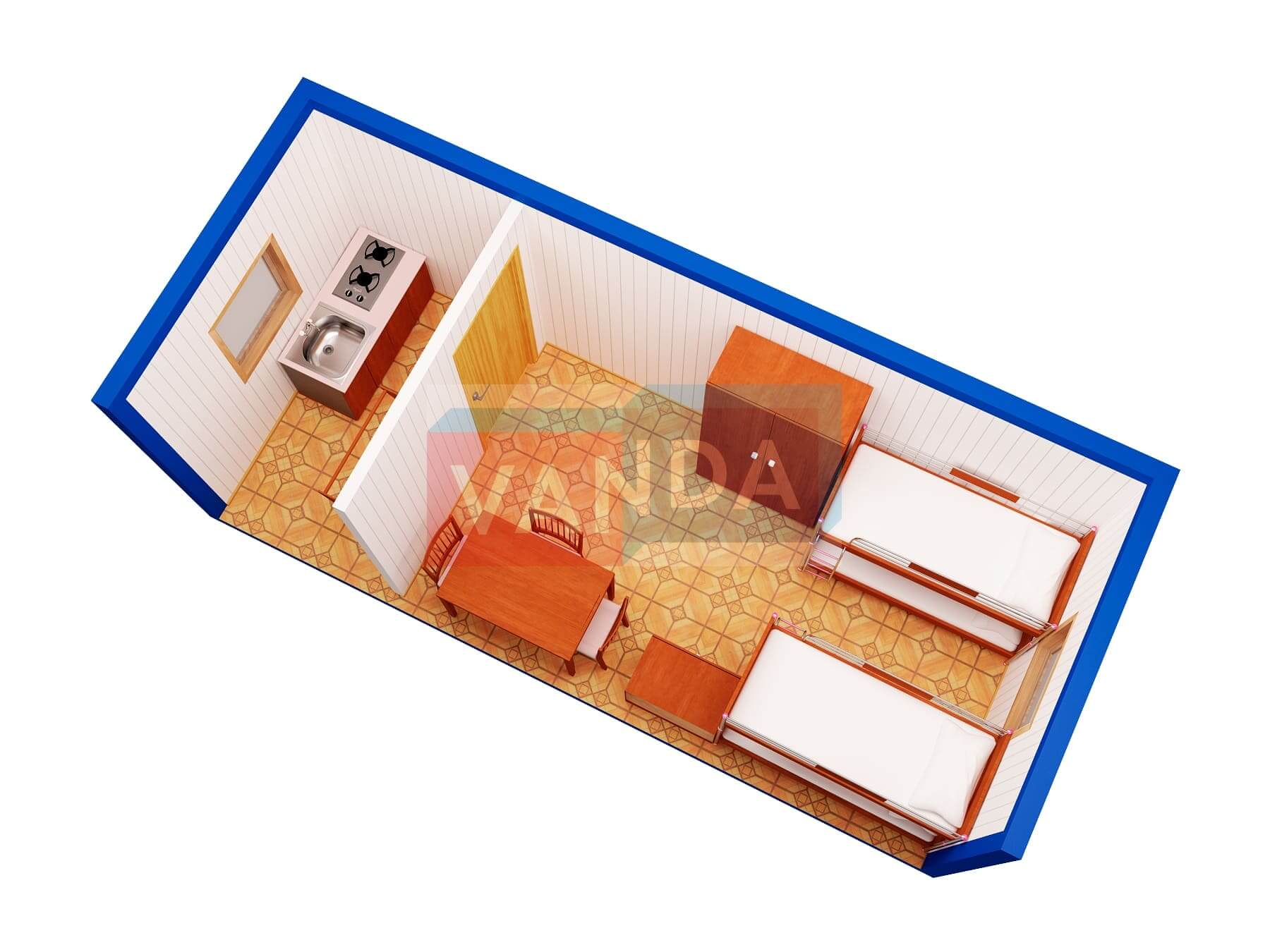 Металлическая бытовка с кухней в тамбуре 5,85 x 2,4 - Вагонка ПВХ изготавливается из несущего каркаса (верхняя и нижняя обвязка): швеллер 100х50х3 мм., угловые стойки: сложно - гнутый угол 90х90х3 мм., крыша блок-контейнера: металл сварной 0,9-1 мм., качественная наружная отделка: оцинкованный профлист, вспомогательный деревянный каркас (стены) выполнен из брусок 40х75 мм., лаги пола: обрезная доска 40х100 мм., лаги потолка: обрезная доска 40х100 мм., выполнено утепление: Минеральная вата «ISOVER» – 50 мм. и пароизоляция: плёнка техническая, черновой пол состоит из: обрезная доска 20 мм. (2 сорт), чистовой пол покрыт: ДСП строительное 16 мм., отделка пола выполнена из качественных материалов. Контейнер комплектуется окнами: деревянное, двойное остекление 800х1000, входной дверью: ДГ 21-8 обшита снаружи оцинкованным листом, врезной замок и внутренними дверями. Если в БК присутствуют перегородки, то для них используется: брусок 40х50 мм.